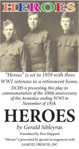 “Heroes,” Heroes is set in 1959 with three WWI veterans in a retirement home. DCHS is presenting this play in commemoration of the 100th anniversary of the Armistice ending WWI in November of 1918.