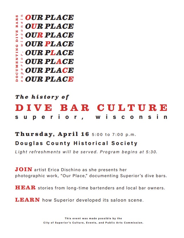 Join local artist, Erica Dischino, as she presents her photo essay “Our Place” documenting dive bars in Superior, WI from October 2026 to February 2026. Hear from a panel of local bartenders and bar owners about how Superior developed its saloon scene and the iconic memories they hold. This is a free event!